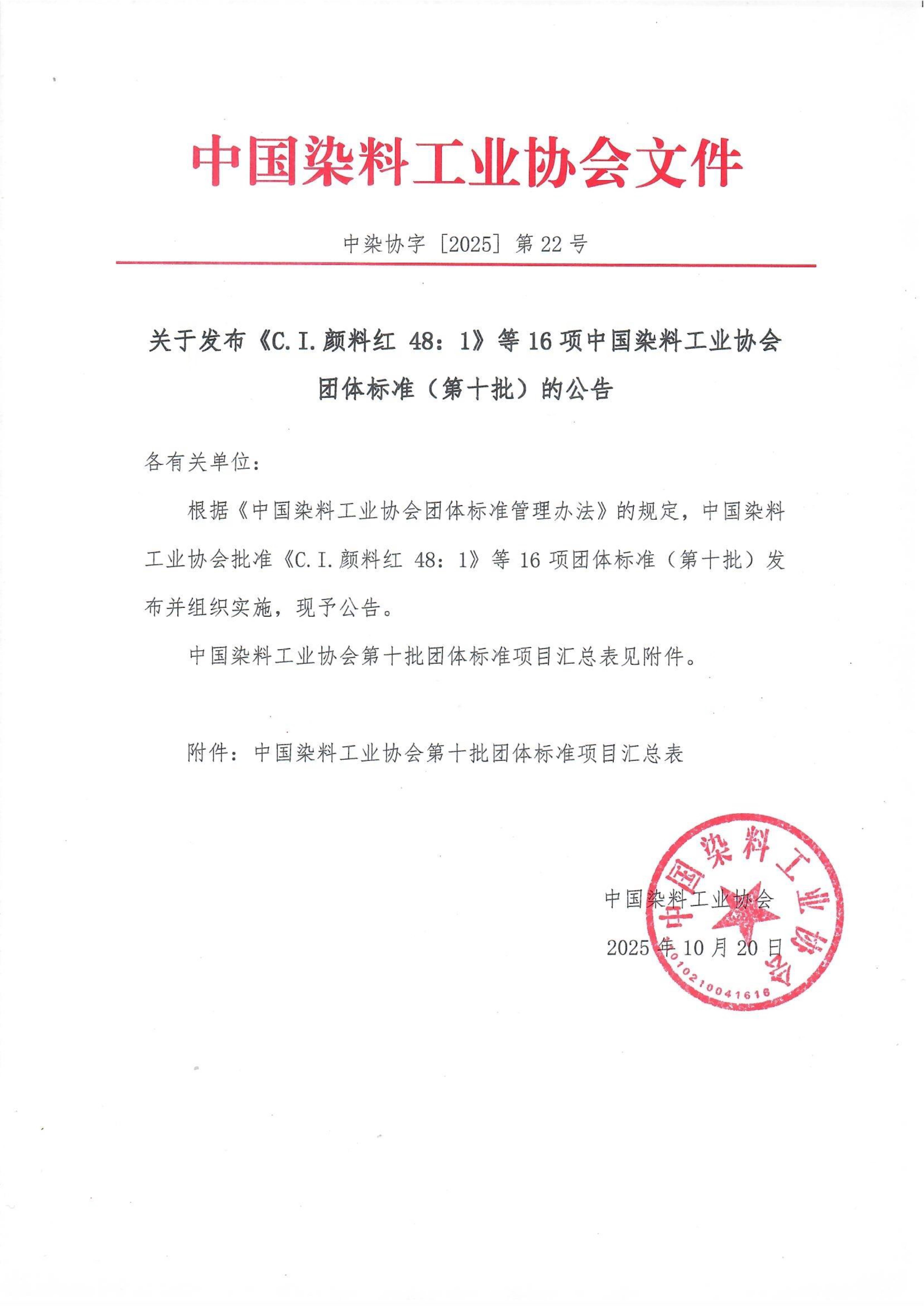 中国染料工业协会关于发布《C.I.颜料红 48:1》等16项团体标准(第十批)的公告
