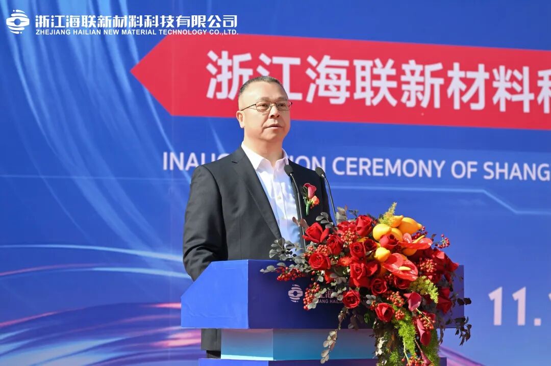 海联董事长陆海才先生在致辞中首先对参加庆典的合作伙伴和客户表示感谢,期望在后续合作中继续携手奋进、合作共赢、共同发展。同时感谢广大员工的辛勤付出。最后,他表示此次上虞新厂区的投产是企业的新起点,海联将以全新理念开启跨越发展的新纪元。